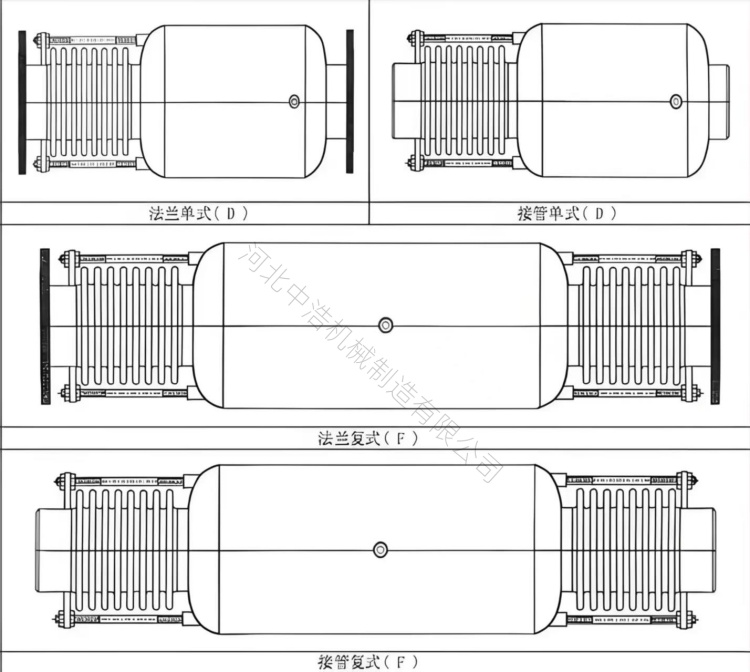 內(nèi)外壓波紋補(bǔ)償器也稱壓力平衡型波紋伸縮器,主要用管道道吸收熱脹冷縮引起位移的補(bǔ)償裝置。主要結(jié)構(gòu)由內(nèi)壓波紋管、外壓波紋管、接管、端板、平衡拉桿等組成,其中內(nèi)壓波紋管主要補(bǔ)償內(nèi)部位移,外壓波紋管補(bǔ)償外部位移,接管連接波紋管和管道,而端板對補(bǔ)償器起到額外固定和支撐作用,平衡拉桿起到平衡壓力和保護(hù)波紋的作用。